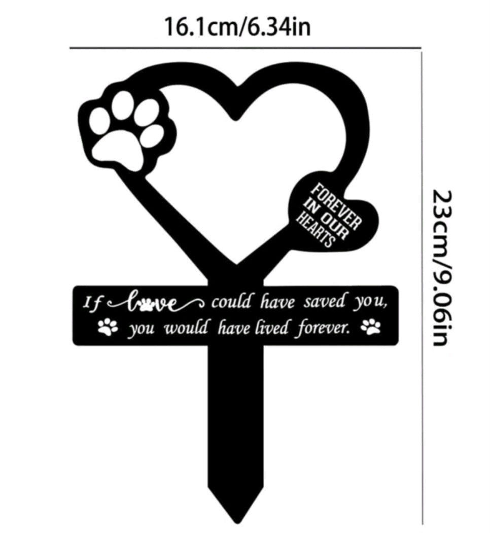 Black And white Acrylic heart shaped grave memorial plaque suitable for Cats & Dogs