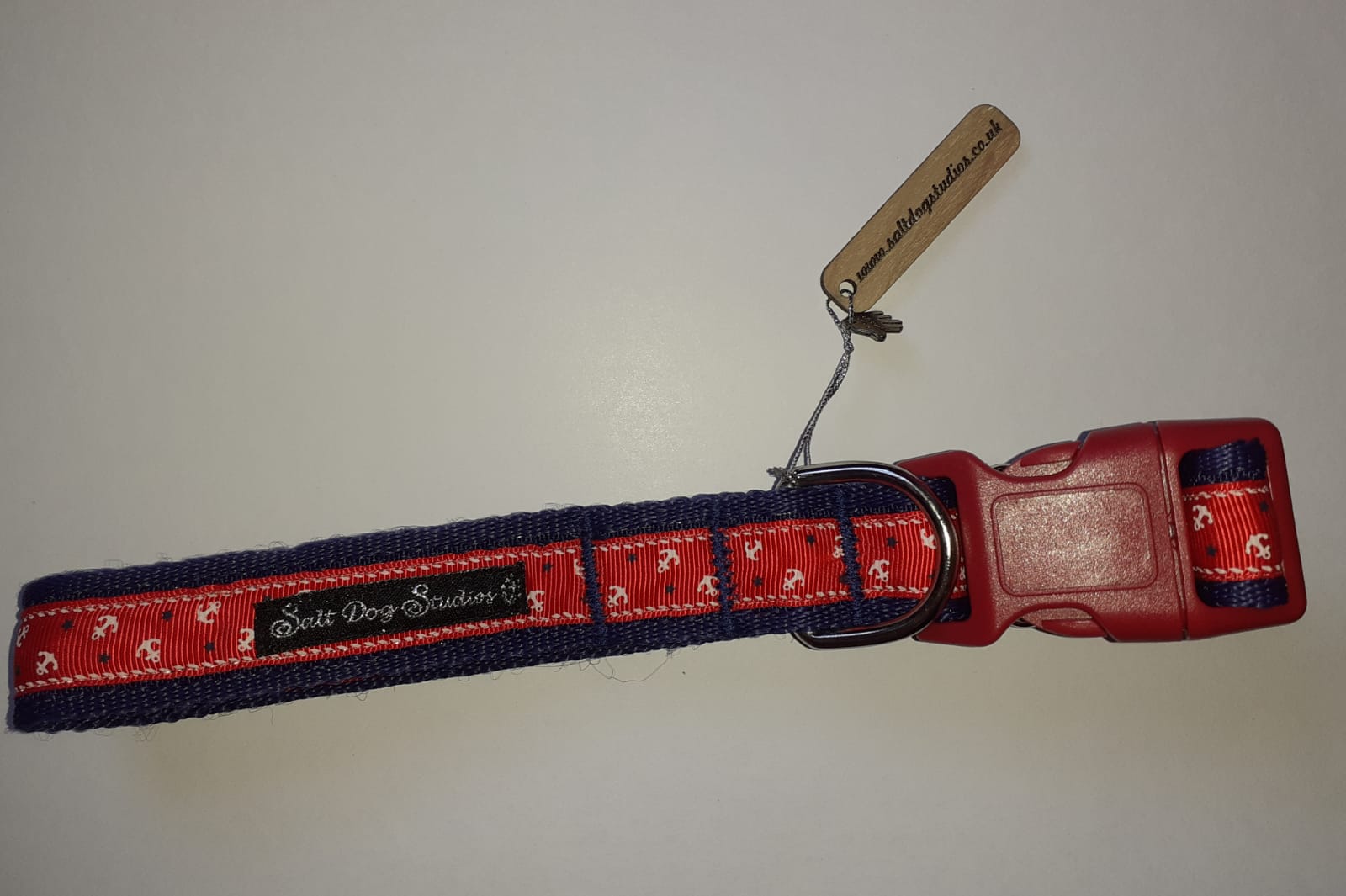 Sailor away dog collar with webbing core for strength, and lined with teal velvet for comfort. A strong teal coloured clasp finishes this design.