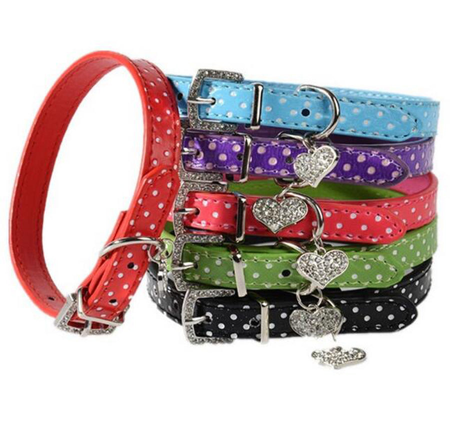 Adjustable Buckle Dog Collar Leather with Diamond Buckle and Heart Pendant
